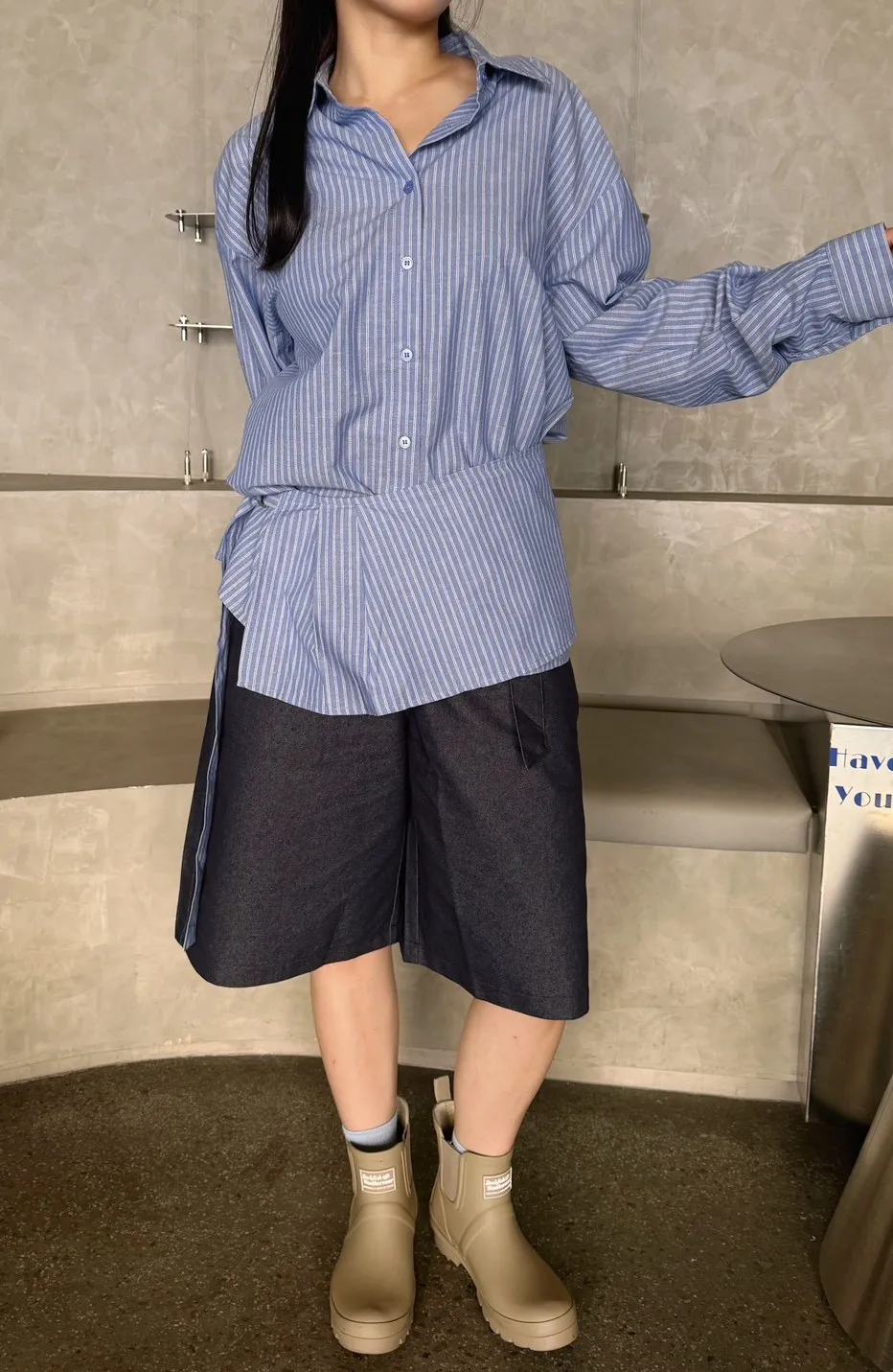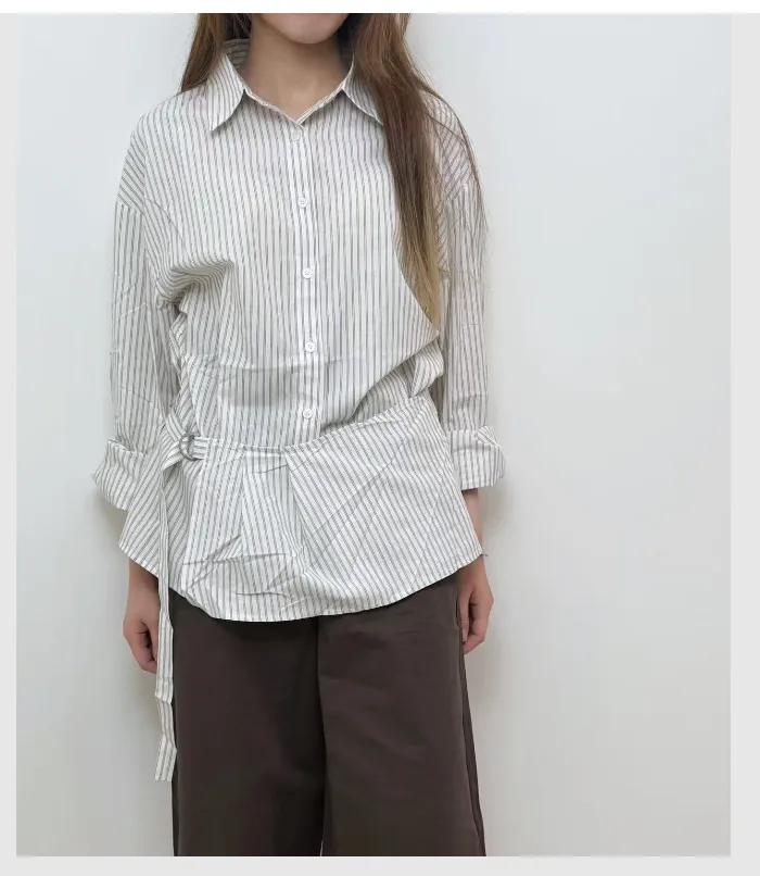 經典條紋,融入不對稱剪裁與側邊綁帶細節,讓基本款襯衫不再只是日常。